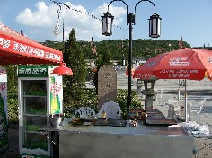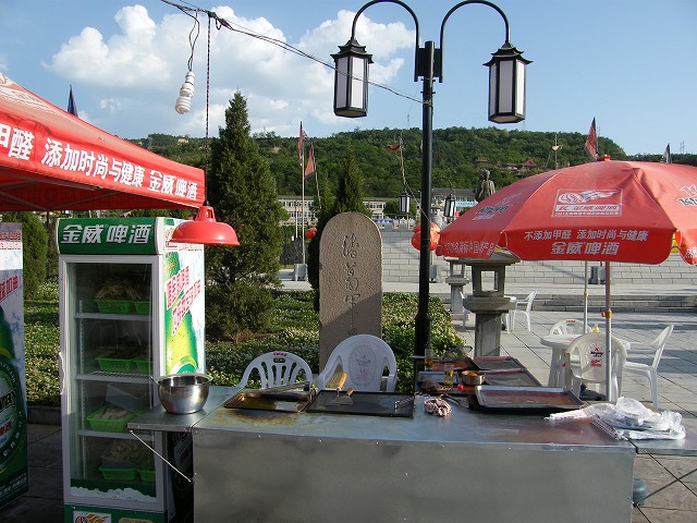石碑のすぐ前で、フランクフルト焼いてます